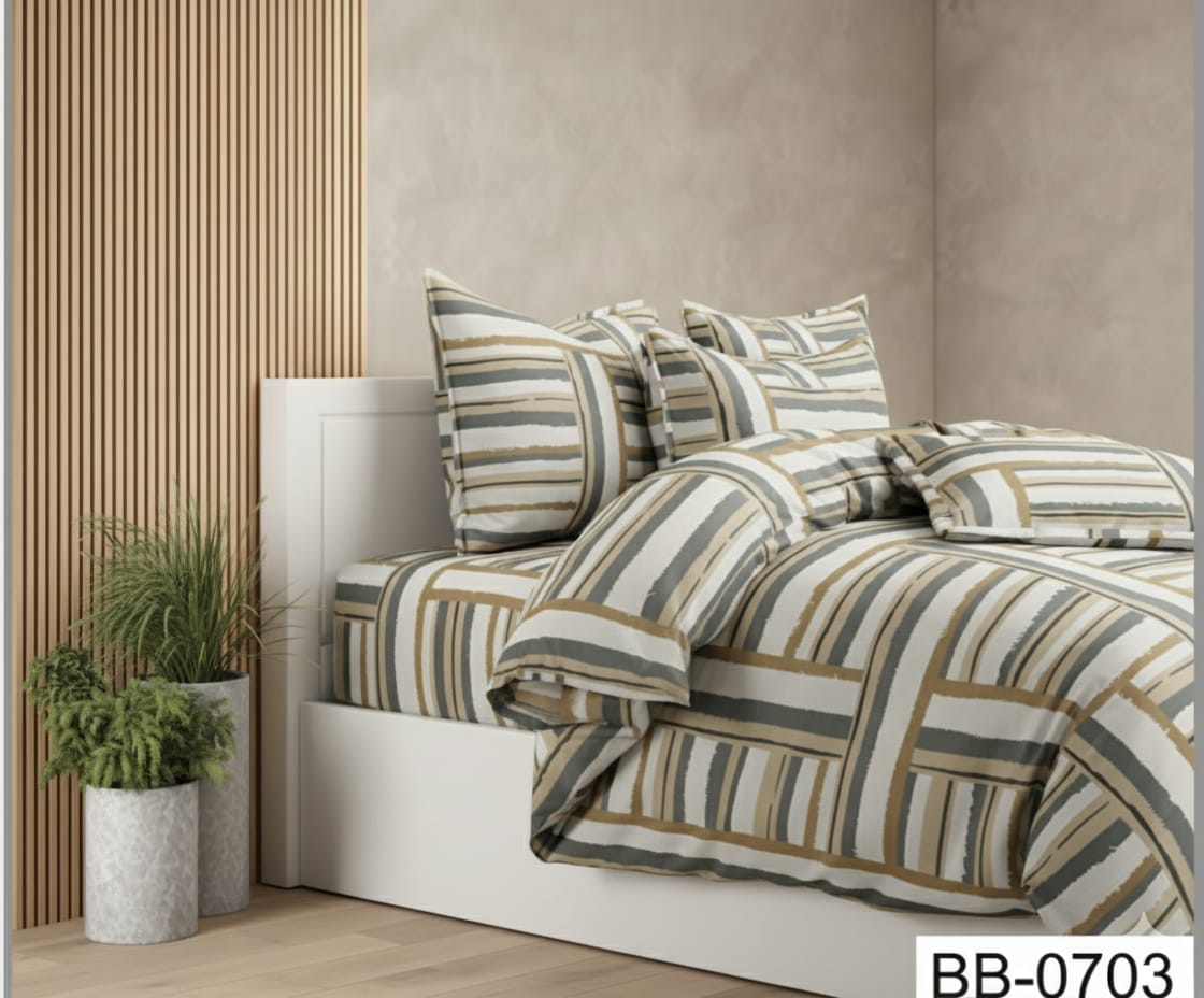 Elevate your bedroom with the Golden Grey Candy Soft Microfiber Striped Printed Bedsheet. Woven from lightweight microfiber (130+ GSM), this King-size sheet ensures softness, breathability, and durability. The striped design in golden grey adds chic, modern elegance. Includes 1 bedsheet and 2 pillow covers.
