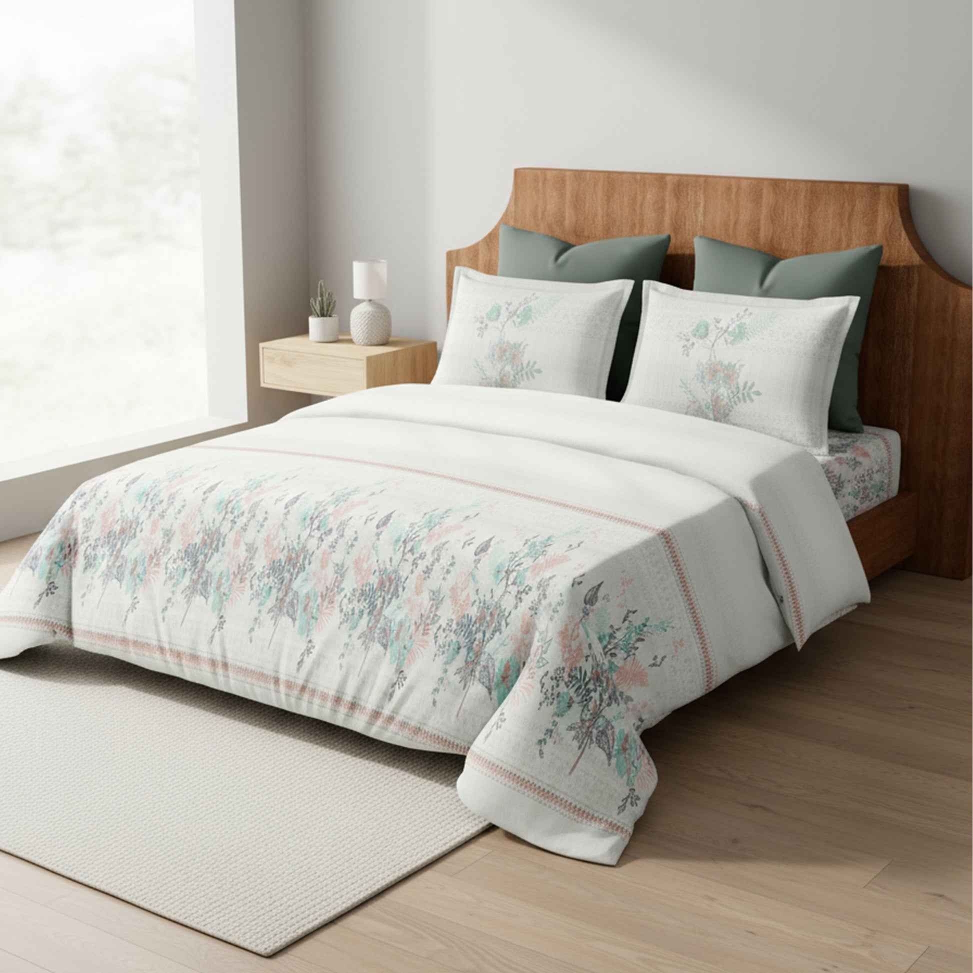 Refresh your space with the Harmony Fusion Floral Mist Blue Bedsheet. 100% cotton, 210 TC, King-size, soft and soothing.