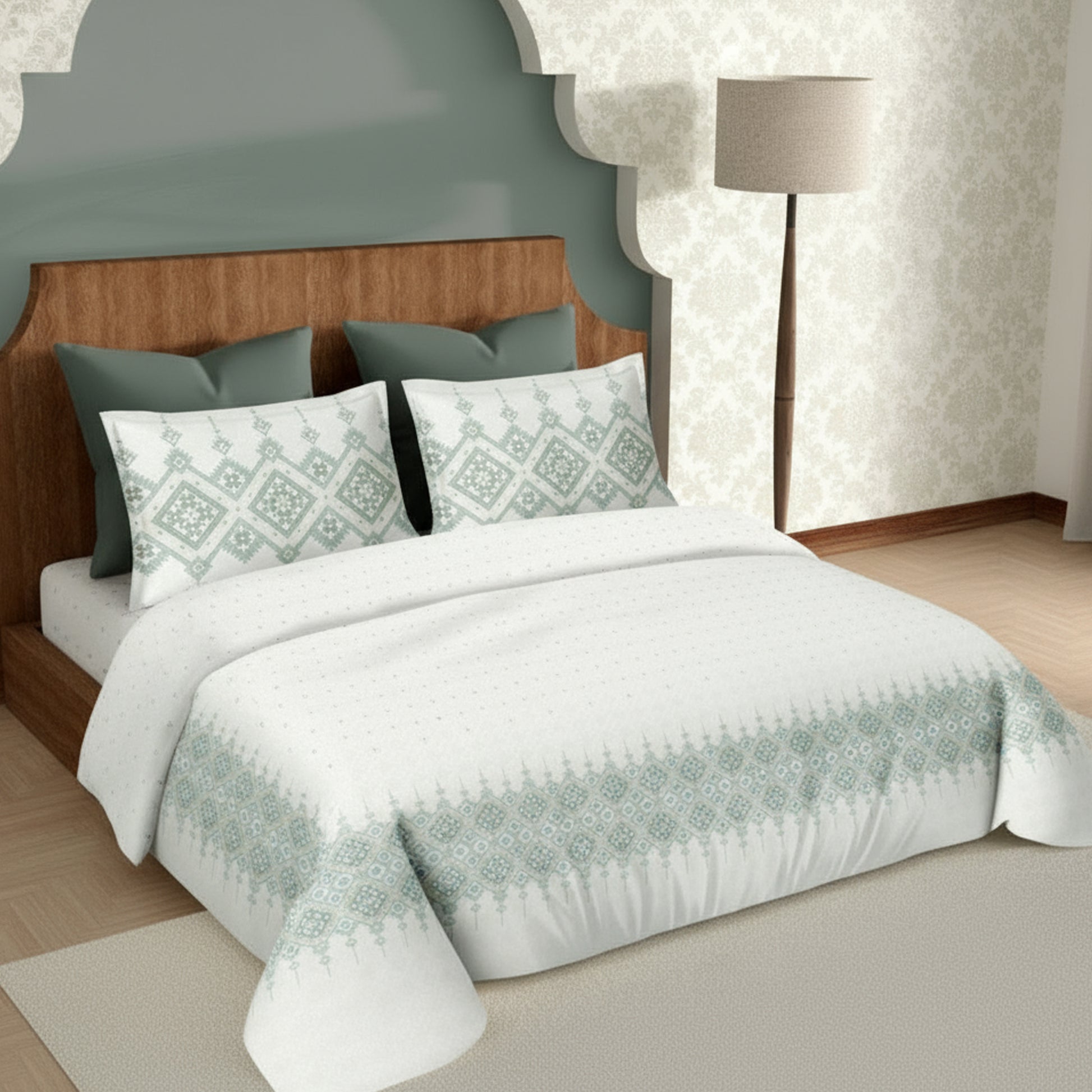 Add a modern touch with the Harmony Fusion Heritage Grid Olive Green Bedsheet. 100% cotton, 210 TC, King-size, soft and stylish.